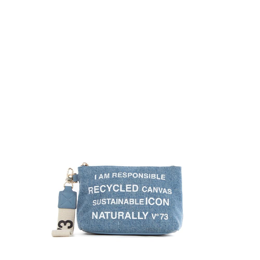 Beauty in Canvas realizzato con una percentuale di cotone preconsumer riciclato e fodera in RPET, 100% poliestere post consumer riciclato, dettagli in nappa riciclati e polsiera in nastro logato. La stampa in contrasto riporta iconiche frasi ispirati al mondo Responsible V°73.