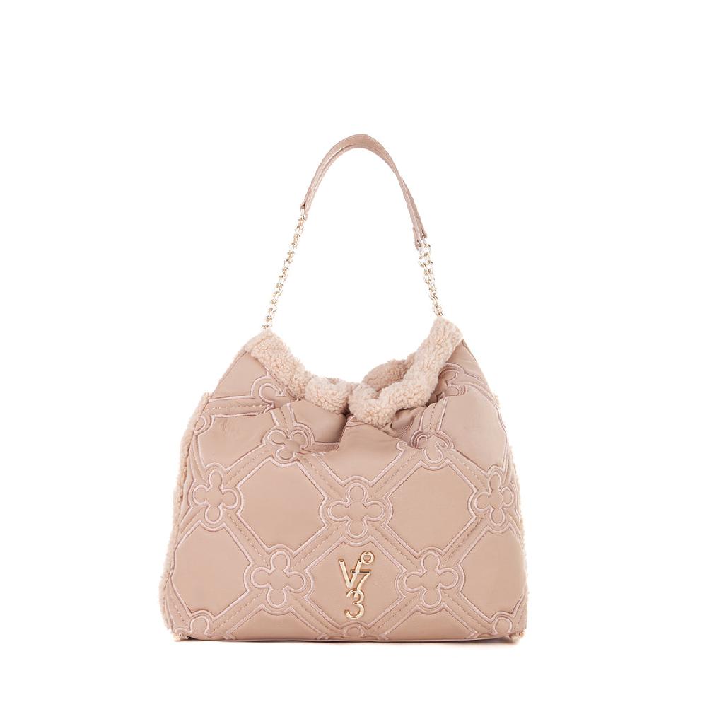 Linea effetto shearling, con maxi ricamo all over V73. Maxi logo verticale, metallerie in oro chiaro. Chiusura con bottone magnetico.