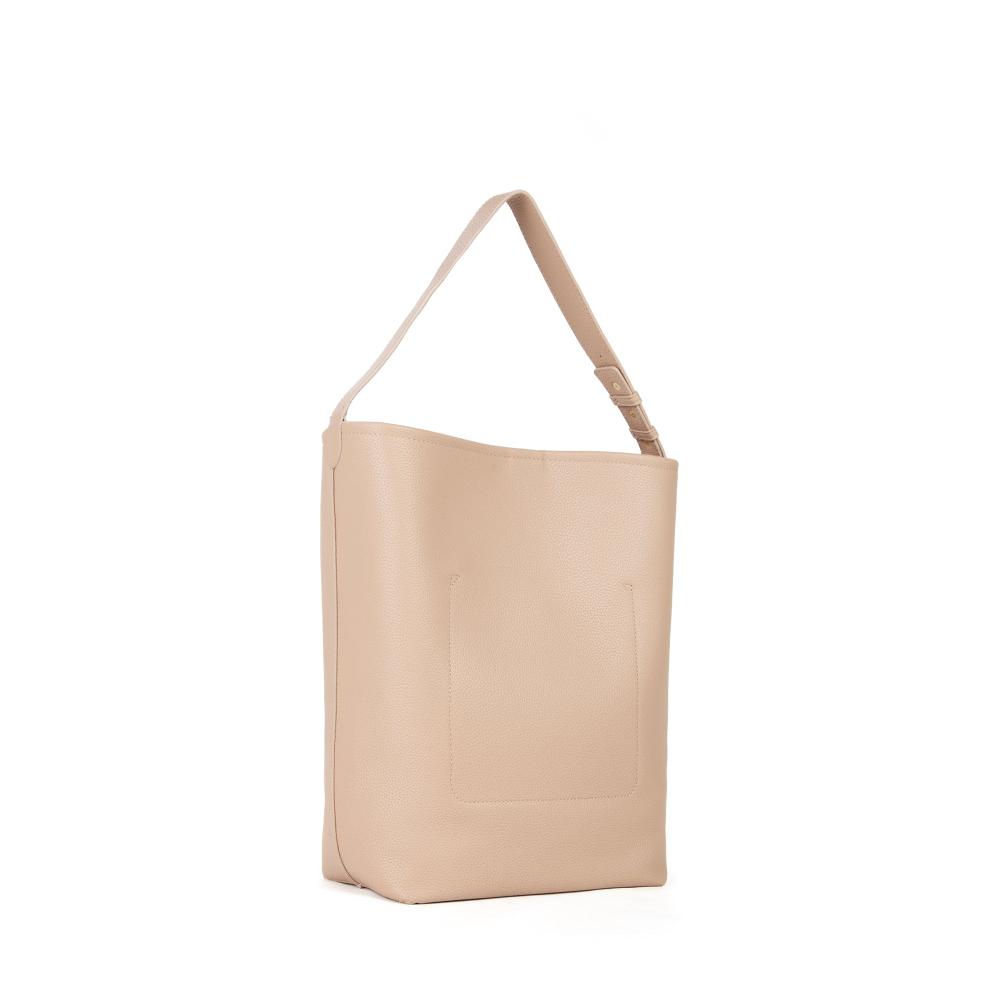 Sacca in grana sfoderata, con lettere in oro chiaro. Pochette interna estraibile, chiusura con bottone magnetico. Tracolla regolabile.